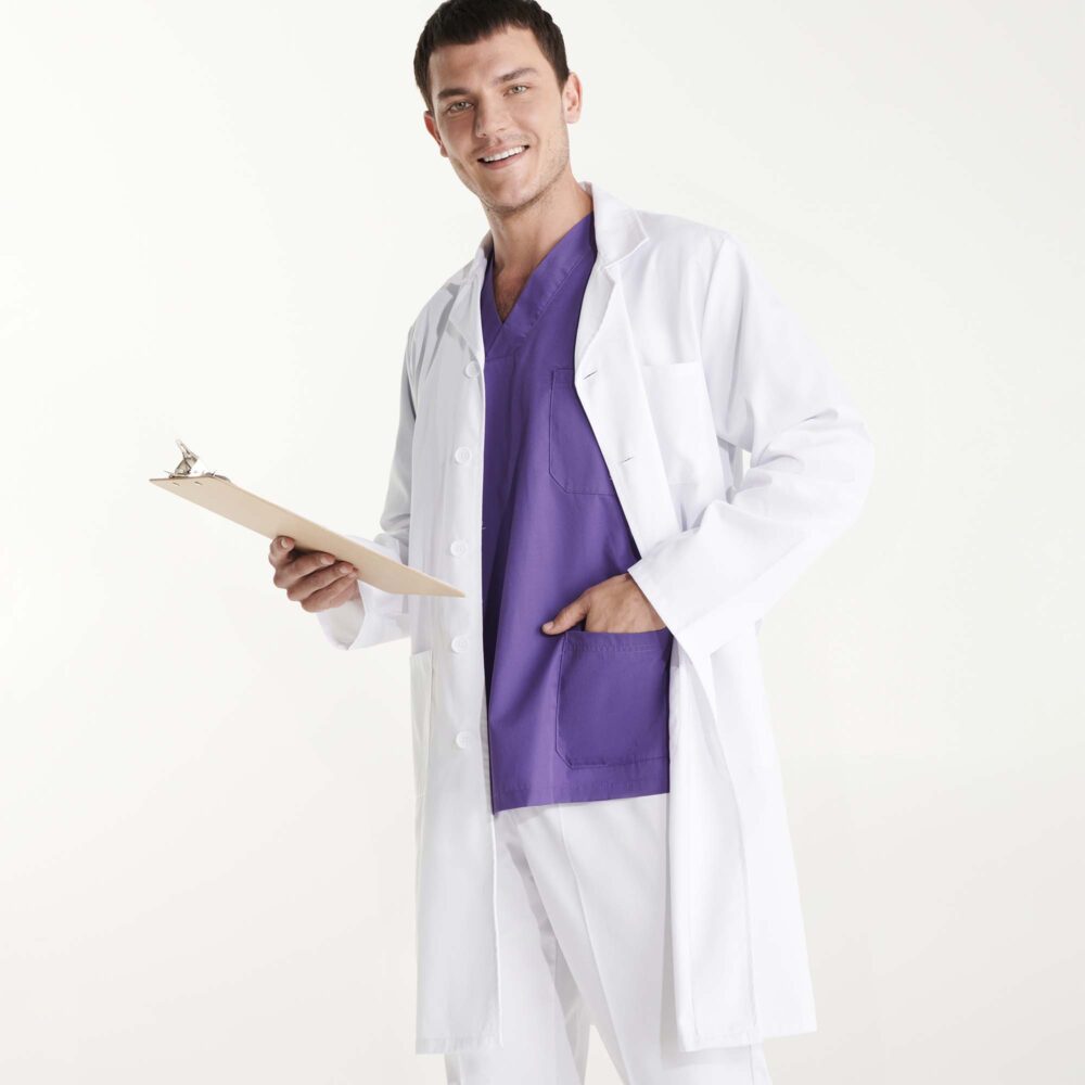 Μακρυμάνικη ποδιά -1. Γιακάς με φλαπ – 2. Κεντρικό άνοιγμα με 5 κουμπιά – 3. Μία τσέπη στήθους και δύο πλαϊνές – 4. Πίσω …